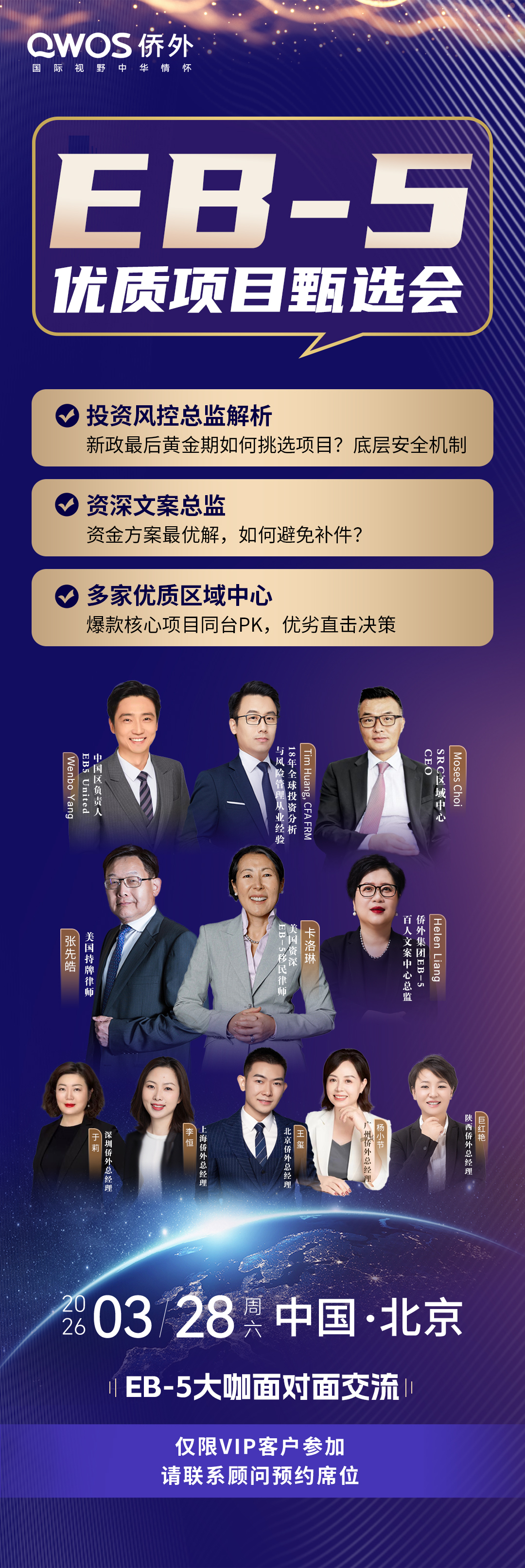 当 EB-5 新政进入关键倒计时,每一步选择都关乎家庭未来。侨外特别策划「2026 美国移民全景规划私享会」,邀您共聚北京,与行业大咖面对面,解锁留美、移民、资产配置的核心答案。