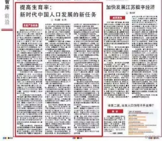 关注8月14日《新华日报》在第13版“思想周刊·智库”栏目刊发了一篇题为《提高生育率:新时代中国人口发展的新任务》的署名文章,并被各大网络媒体转载,其大意是: “40岁以下公民,不论男女,每年必须以工资一定比例缴纳生育基金进入个人账户。只有在家庭生育二胎的时候,才可以申请取出生育基金。如果公民未生育二胎,只能等到退休之后才能领取。”
