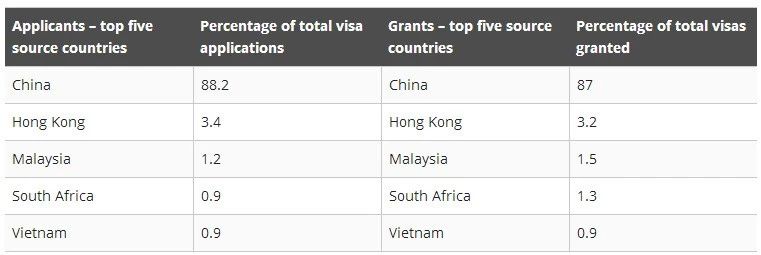 具体来说,中国大陆和香港的申请人占到了总申请人数的91.6%,其次是马来西亚人,约占总申请人数的1.2%,份额差距悬殊。相应地,中国也是拥有居多188C签证获批人数的国家。