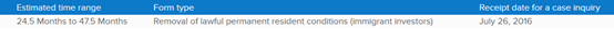 2. I-829申请的审理时间为24.5—47.5个月,可查询案件的日期为2016年7月26日: