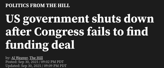 关注10月1日,美国联邦政府因国会未能及时通过预算案,再次陷入“关门”(shutdown)状态。