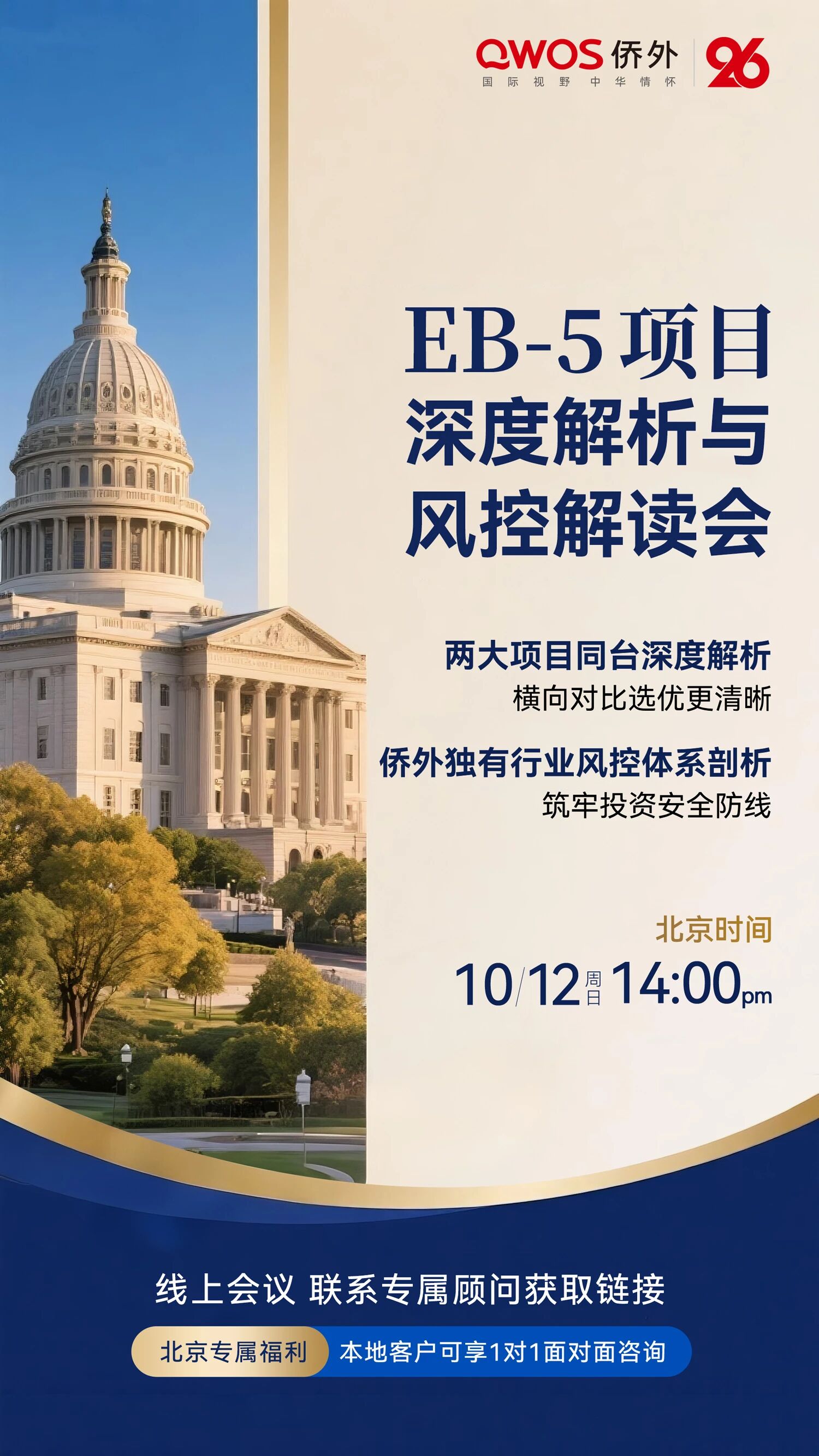 想了解更多相关信息的朋友,欢迎参加侨外出国10月12日(周日)下午14:00 举办的《EB-5项深度解析与风控解读会》线上活动。