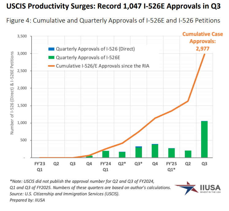 与此同时,移民局在2025财年第三季度批准了创纪录的1,047份I-526E申请,创下新政实施以来的季度最高纪录。但如果继续保持当前的审批与签证发放节奏,中国申请人距离出现“纸面排期”的时间正日益逼近。