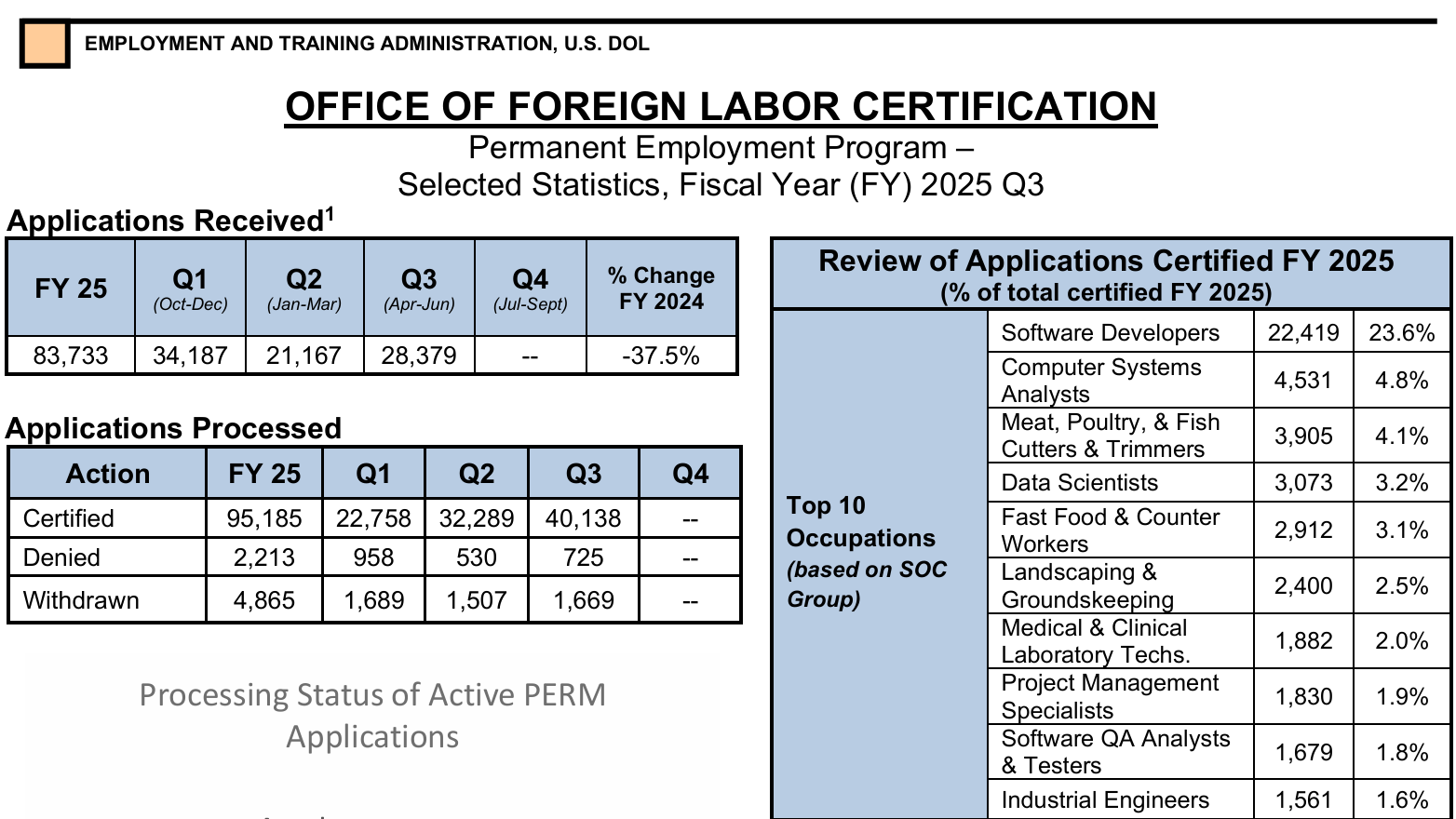 美国劳工部的最新公开数据显示,2025财年第三季度,PERM的提交量仅28,379份,同比暴跌37.5%,为2017财年以来最低迷的第三季度。
