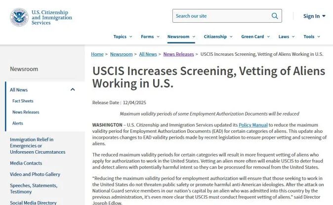 该新规将于12月5日起正式实施,适用于此后提交的所有EAD工卡申请,目前已提交但尚未获批的申请也将按此标准执行。