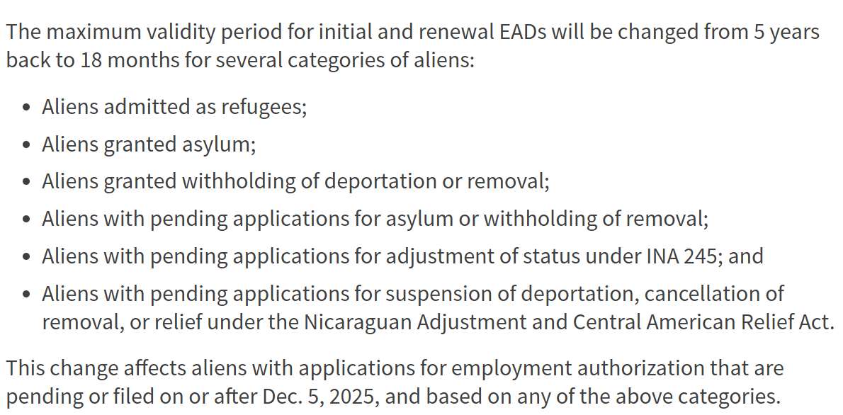 这意味着自2025年12月5日开始,相关申请人所获工卡有效期最长仅为18个月,之后需每一年半重新提交I-765表格、缴纳申请费、重新采集指纹并进入审批队列。
