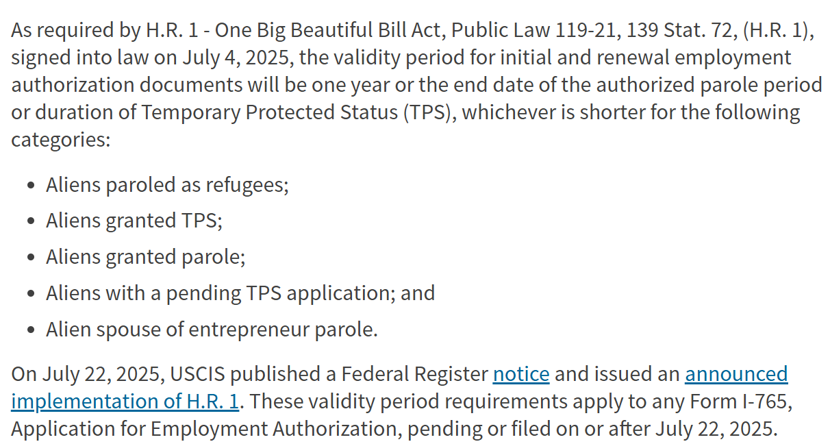 除此之外,涉及 TPS(临时保护身份)持有人,他们的工卡未来最长期限只有一年: