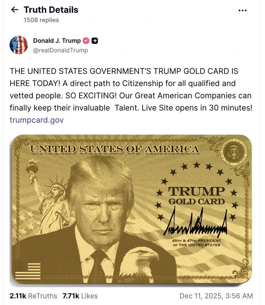关注美国总统特朗普当地时间12月10日宣布,美国政府当天起正式接受“金卡”签证计划的申请。