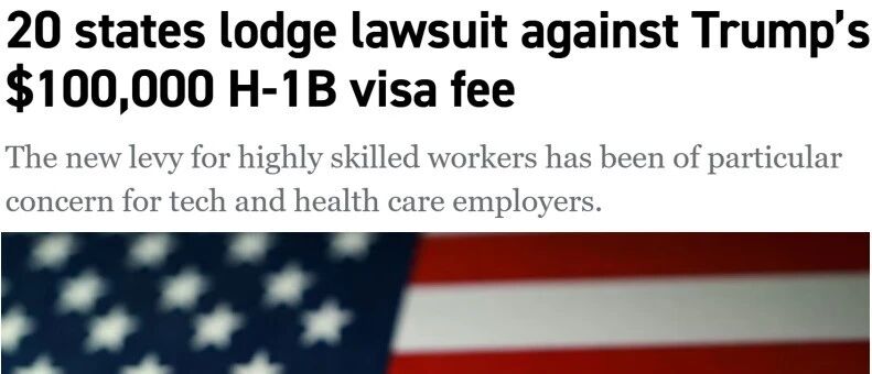 美国加利福尼亚州等20个州近日联合起诉联邦政府,希望阻止其把H-1B签证费用大幅提高至10万美元。