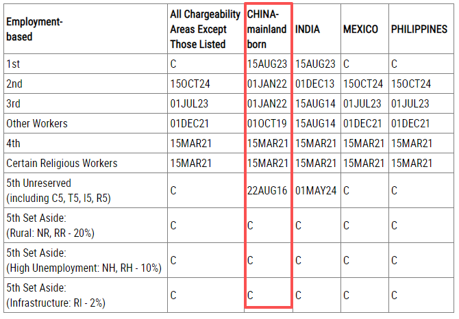 对于中国大陆出生的申请人来说,在1月份的排期中,EB-5非预留签证类别(旧政)表A前进31天,到2016年8月15日。