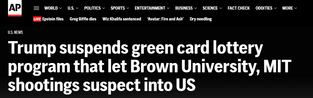 据美联社2025年12月19日报道,美国总统川普下令暂停多元化绿卡抽签计划。该决定是在一起涉及布朗大学和麻省理工学院的枪击案件后作出的。