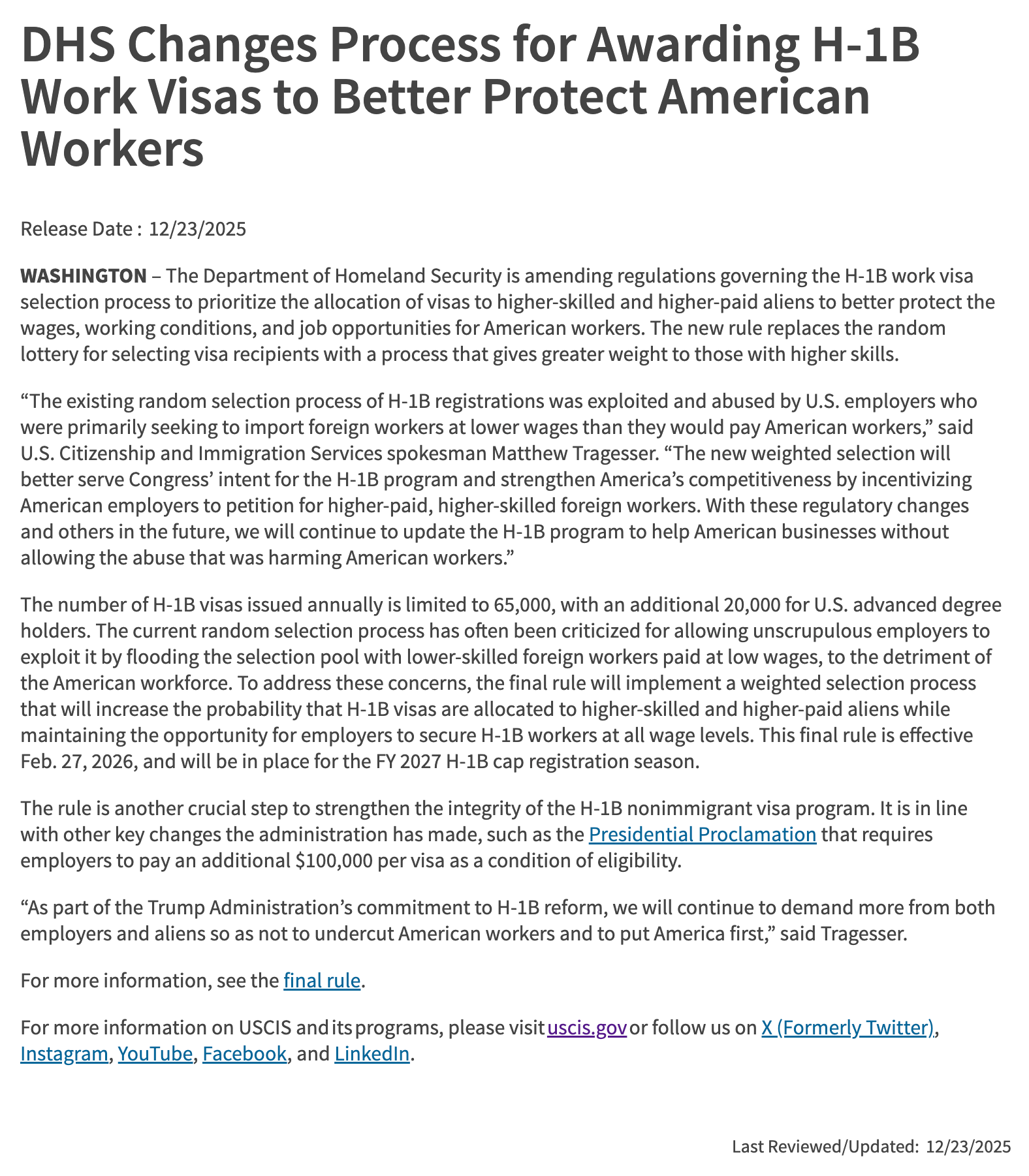 该规定预计将于12月29日正式发布,在完成60天公示期后,将于2026年2月27日正式生效。这意味着,2026年3月开启的H-1B申请季将全面适用这一按工资加权的抽签规则。