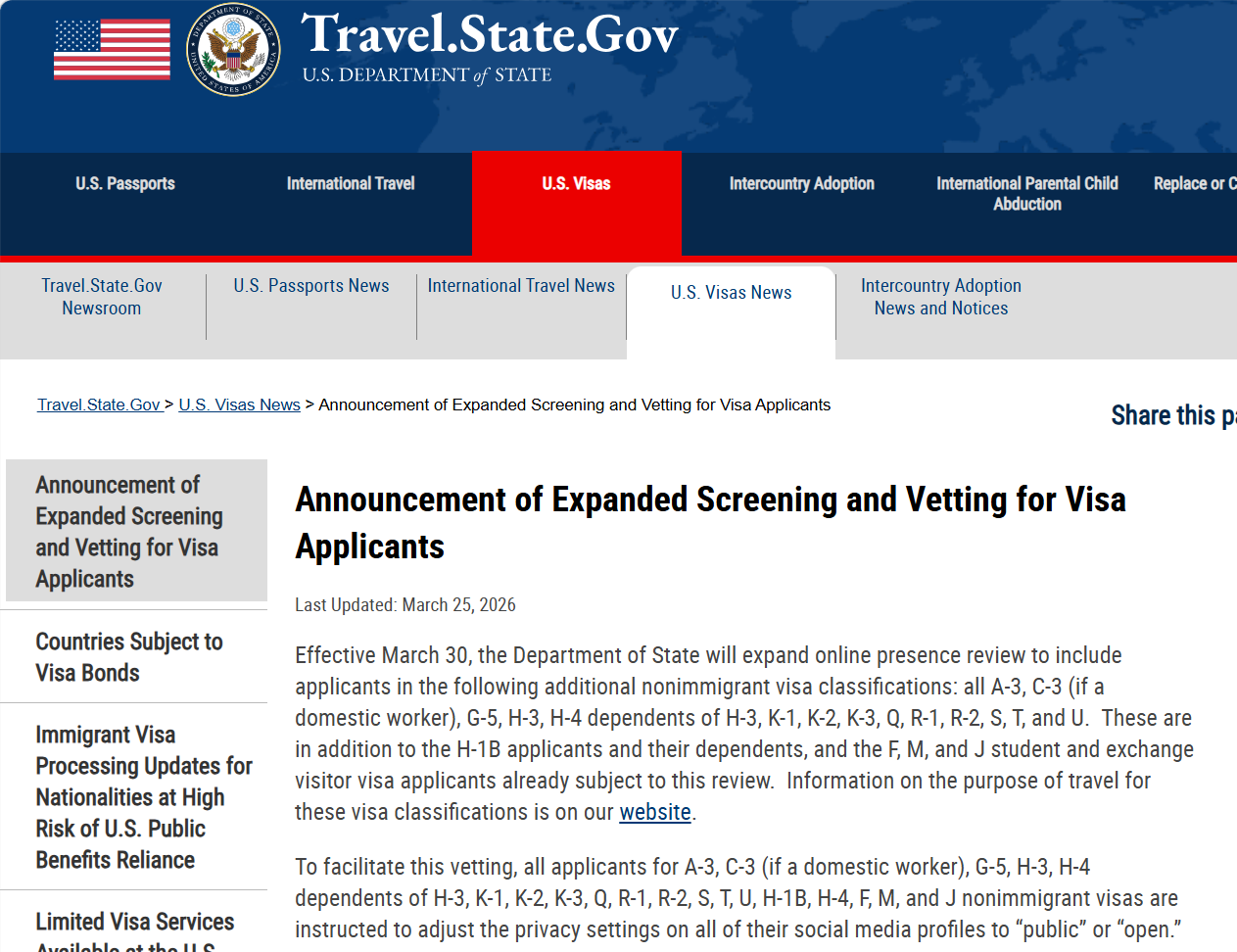 关注当地时间3月25日,美国国务院发布公告称,将进一步扩大对非移民签证申请人的审查范围——