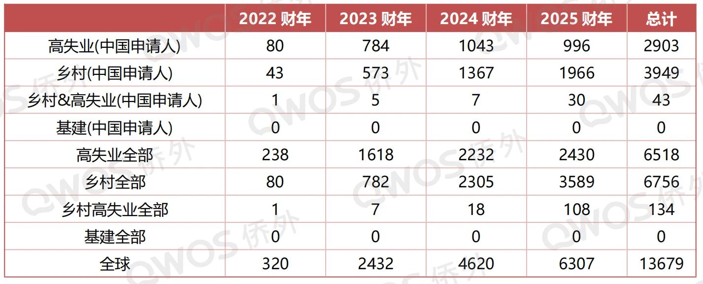 2024财年之前,高失业区申请量略高于乡村地区,但自2024财年起,乡村地区申请量实现反超,至2025财年已领先超过1,100件。