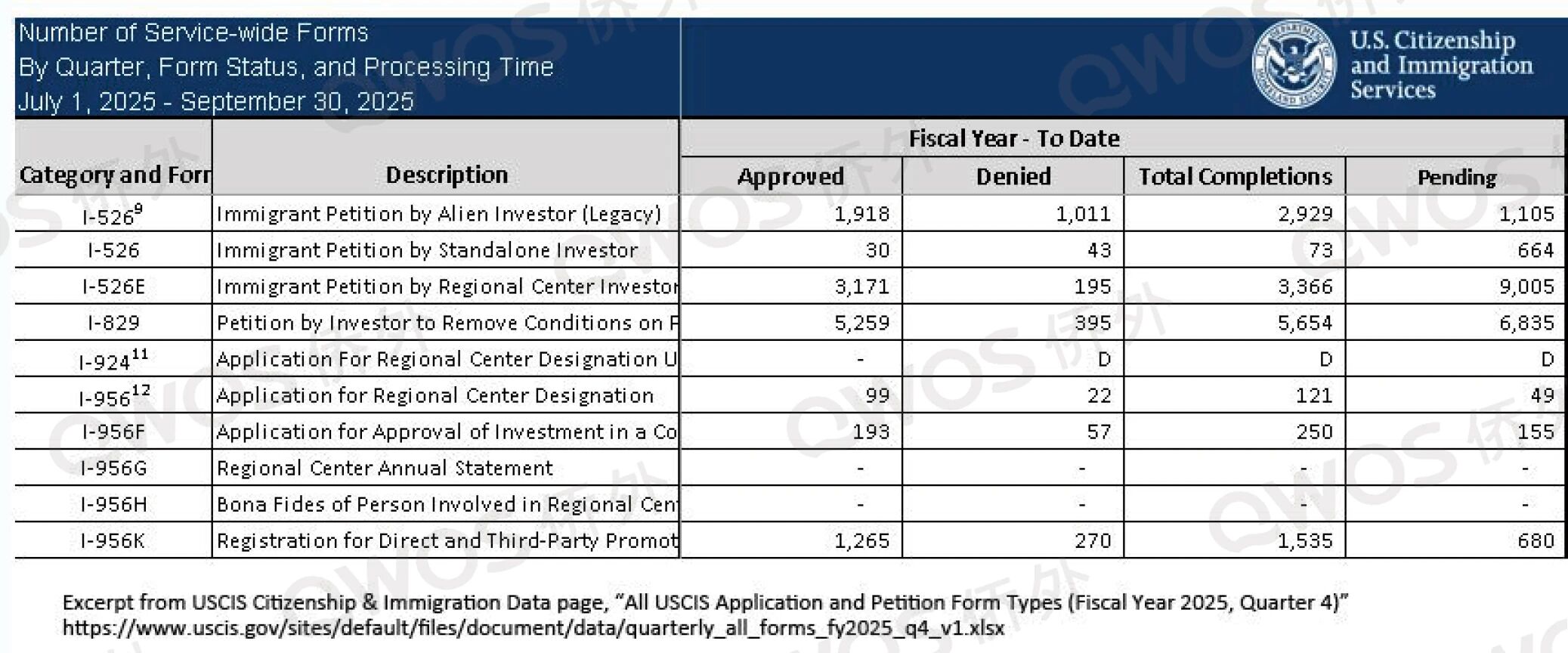 审理周期同样大幅缩短。第四季度I-526E审理周期中位数降至6.5个月,较第三季度的9.2个月进一步提速。新法下的审理速度,正在以肉眼可见的态势加快。