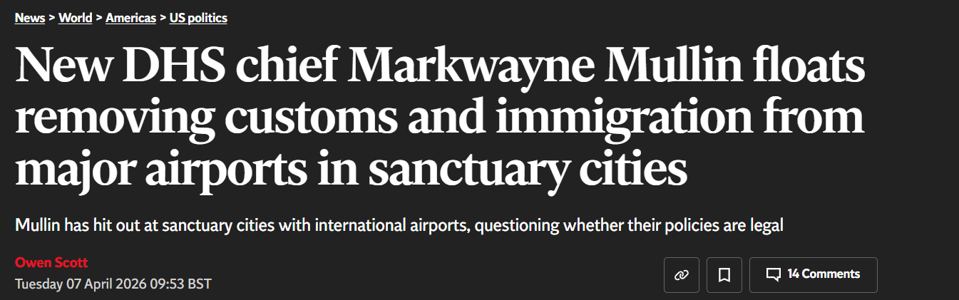 穆林在表态中指出,如果这些城市不愿与联邦政府合作执行现行移民法,那么其机场继续承担国际旅客入境处理职能的“合理性”就值得被重新评估。